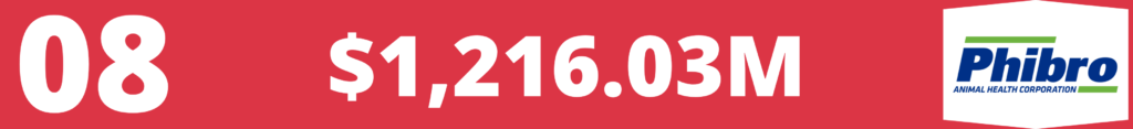 - Its product lineup features established brands such as Bloat Guard, ChlorMax, and Vistore, supporting health, nutrition, and disease prevention across species. In 2024, Phibro reported an impressive 27.98% revenue surge, primarily fueled by the integration and strong performance of the medicated feed additive (MFA) portfolio acquired from Zoetis in late 2024. This strategic expansion significantly strengthened Phibro’s position in the global animal nutrition and health market